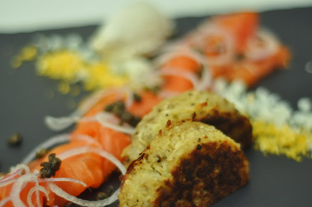 | Hubby’s main course: Cured Salmon, Cream Cheese, Red Onion, Grated Eggs, Fried Capers, Latke.. |