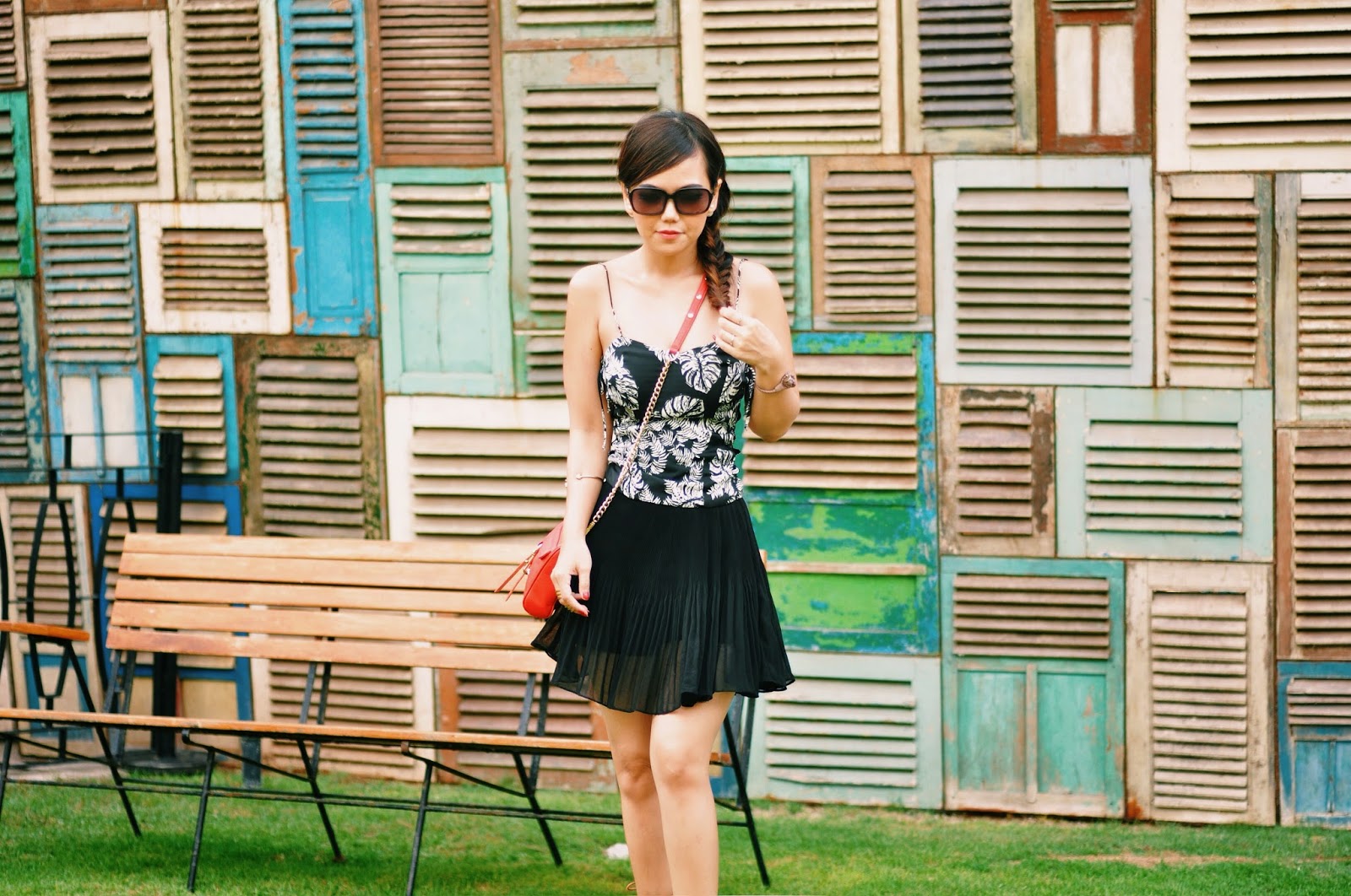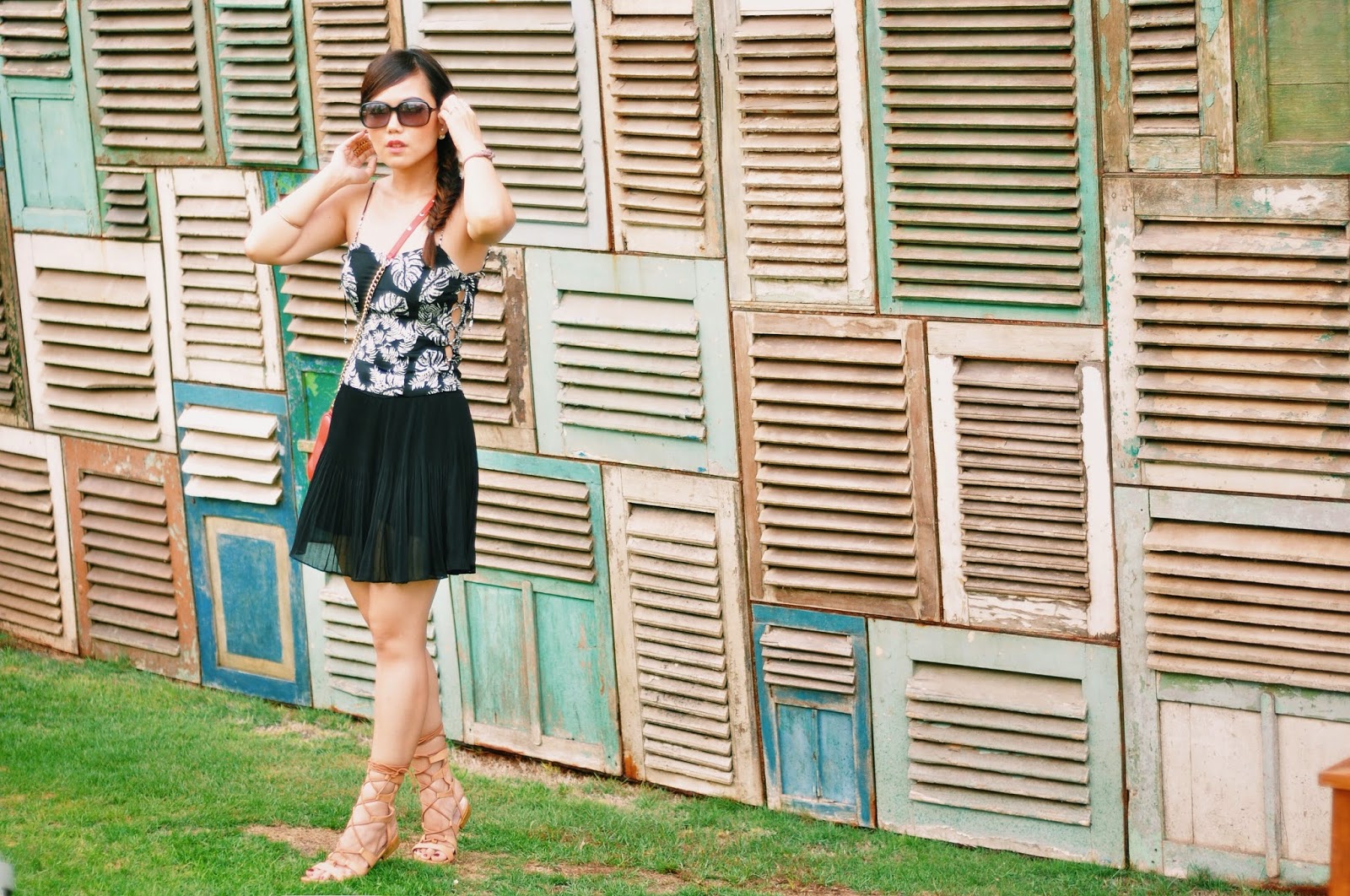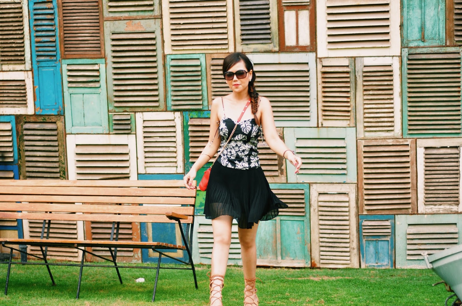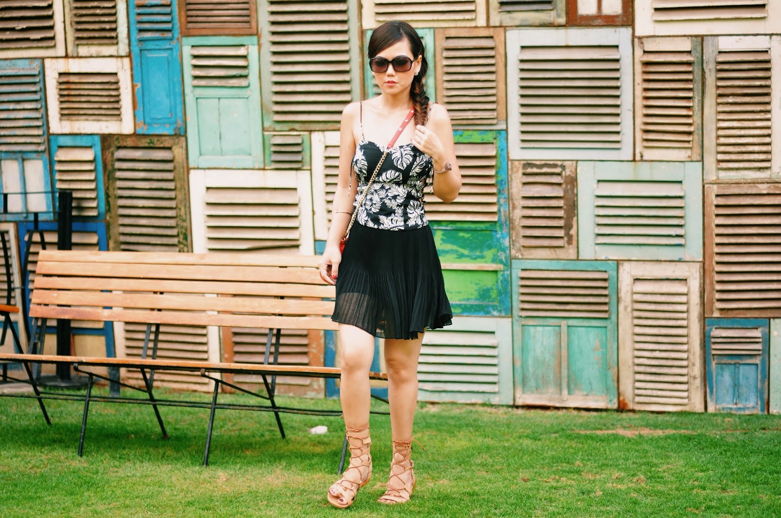 Talking about beach club outfit, i would prefer something light, flowy and comfortable, pairing my lace up bustier from Zara (with tropical leaf prints!) and chiffon pleated skorts (well it appears like skirt, but actually there is a shorts inner :)), some simple accessories, bright colour crossbody bag and lace up gladiator sandals. Don’t forget about dressing up your hair too! I choose to fishtail braid my hair.. And you are ready to be beach goers.. 🙂