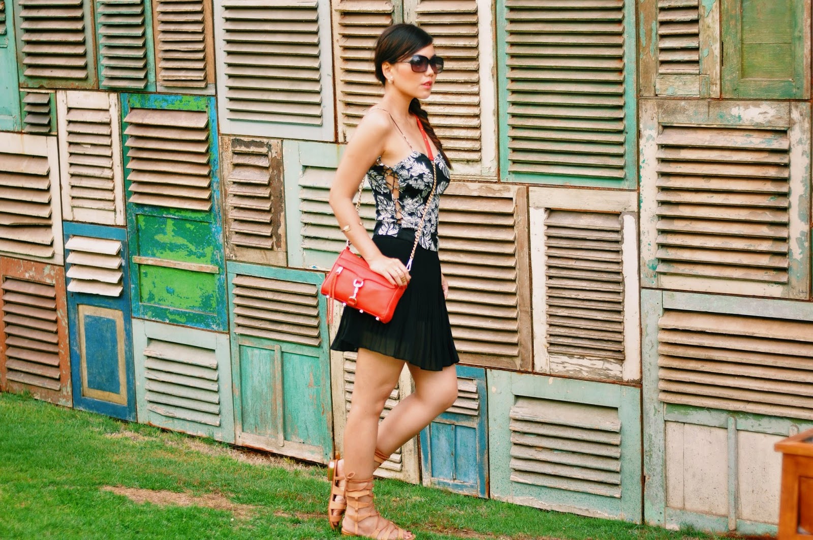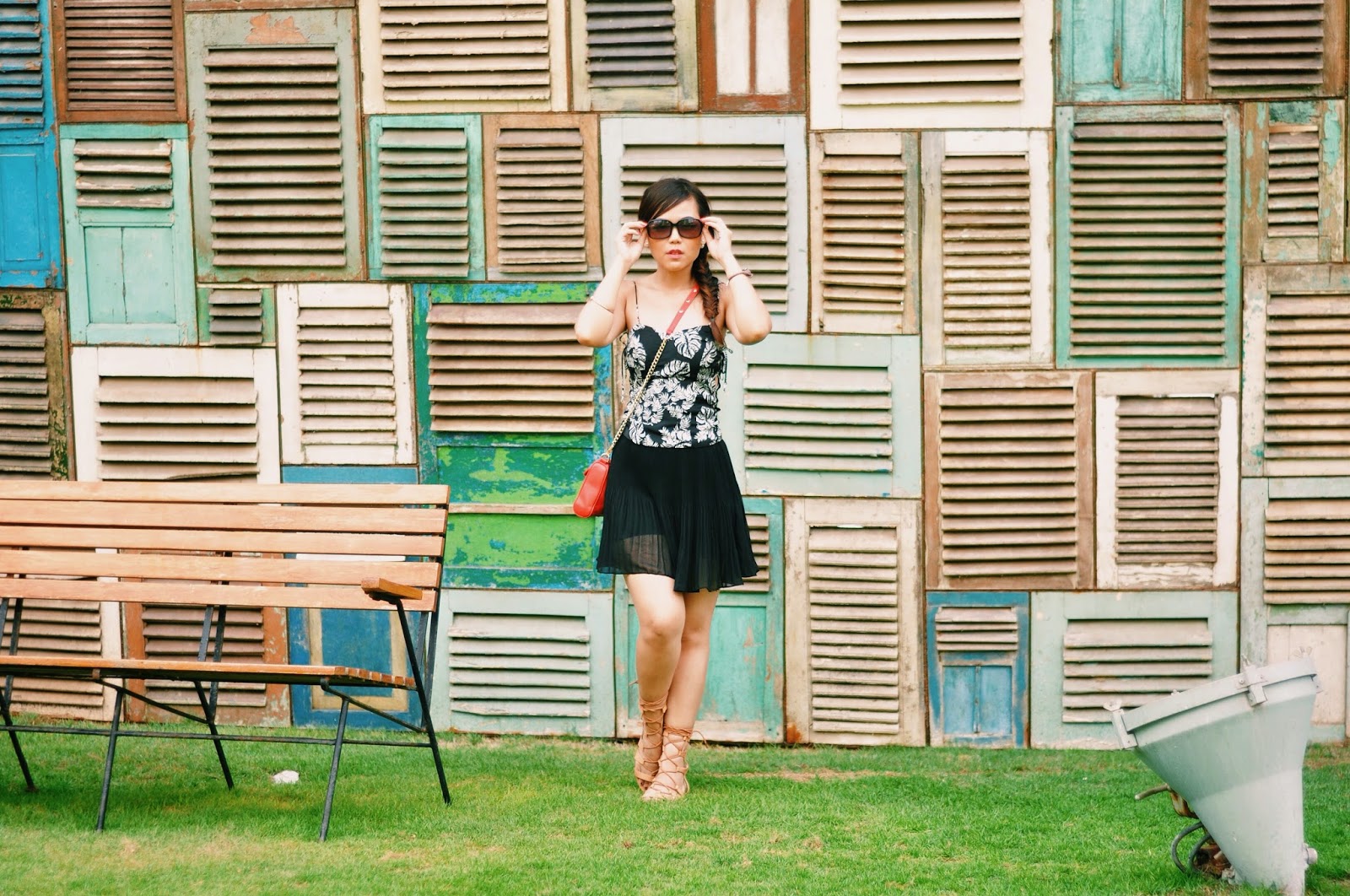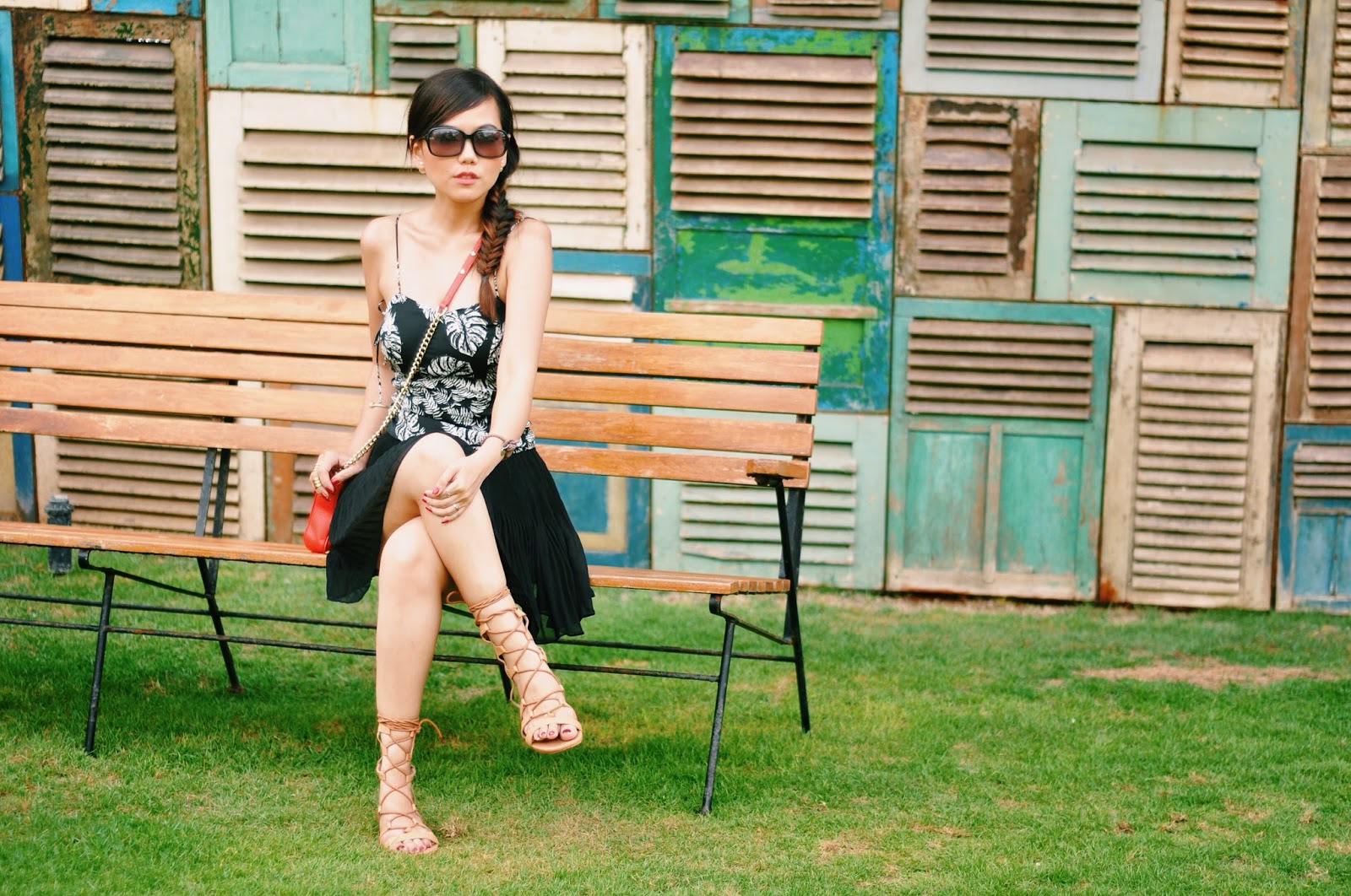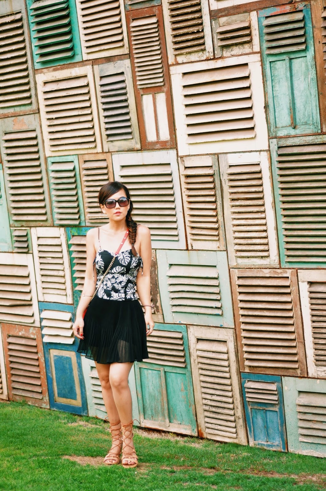 Talking about beach club outfit, i would prefer something light, flowy and comfortable, pairing my lace up bustier from Zara (with tropical leaf prints!) and chiffon pleated skorts (well it appears like skirt, but actually there is a shorts inner :)), some simple accessories, bright colour crossbody bag and lace up gladiator sandals. Don’t forget about dressing up your hair too! I choose to fishtail braid my hair.. And you are ready to be beach goers.. 🙂