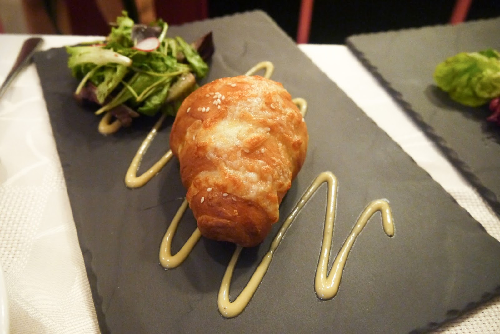 Claimed as an Award Winning, this all-day breakfast favourite is done in 2 ways, poached egg with hollandaise sauce on fig and olive toast and a baked toast cup filled with ham and egg, topped with mozarella cheese served with green pea puree and salad.