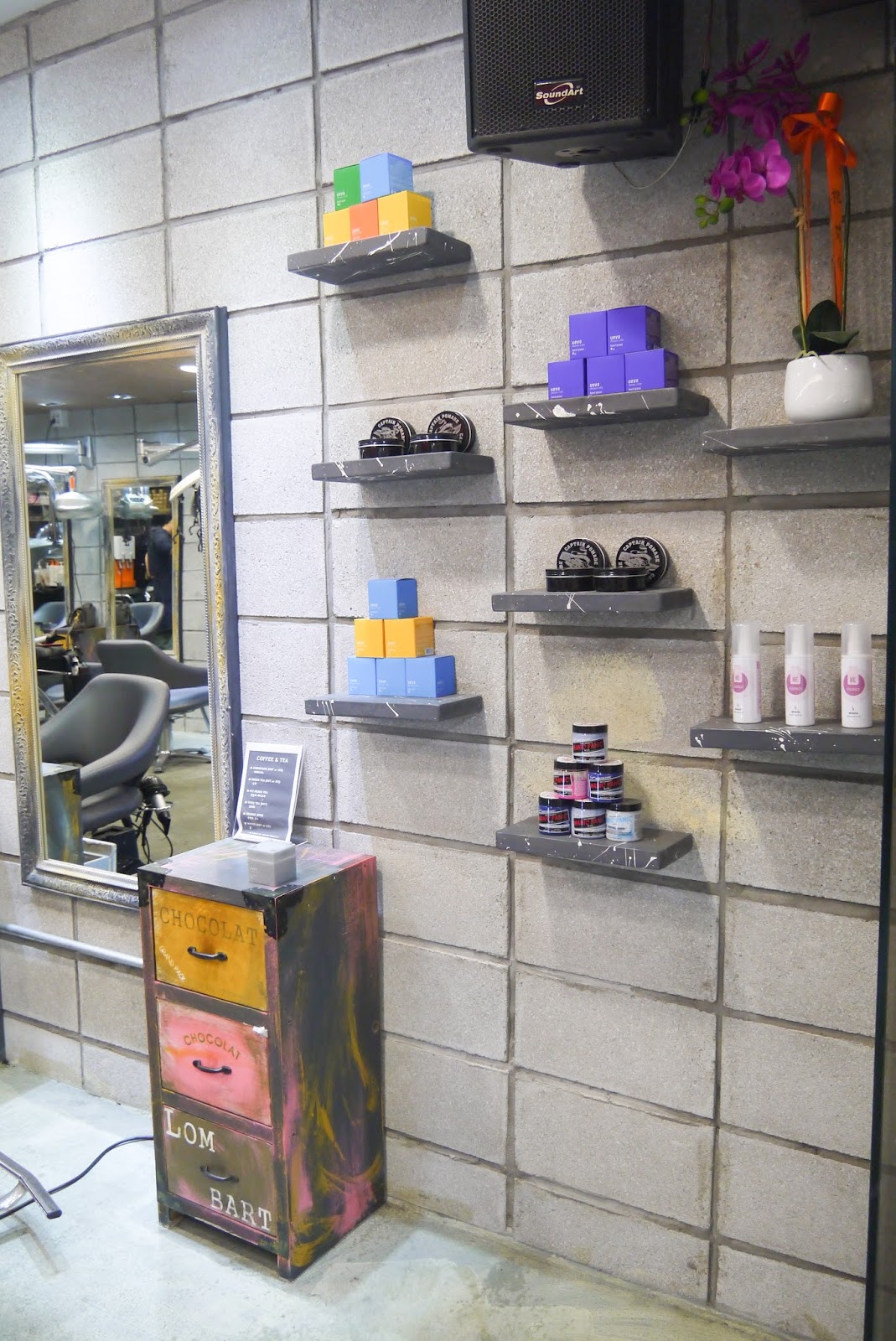 With very unique concept salon deco, rustic stuff, bare concrete industrial look.