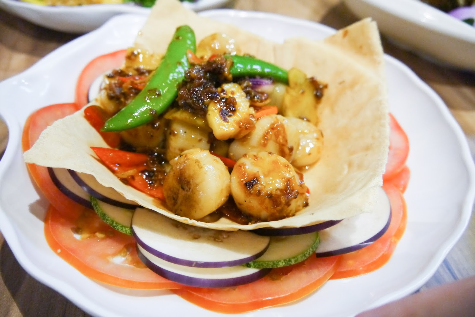This succulent scallop and crunchy vegetables best to have with warm rice and enjoy it with its XO sauce. The edible bowl was made from fried popiah skin.