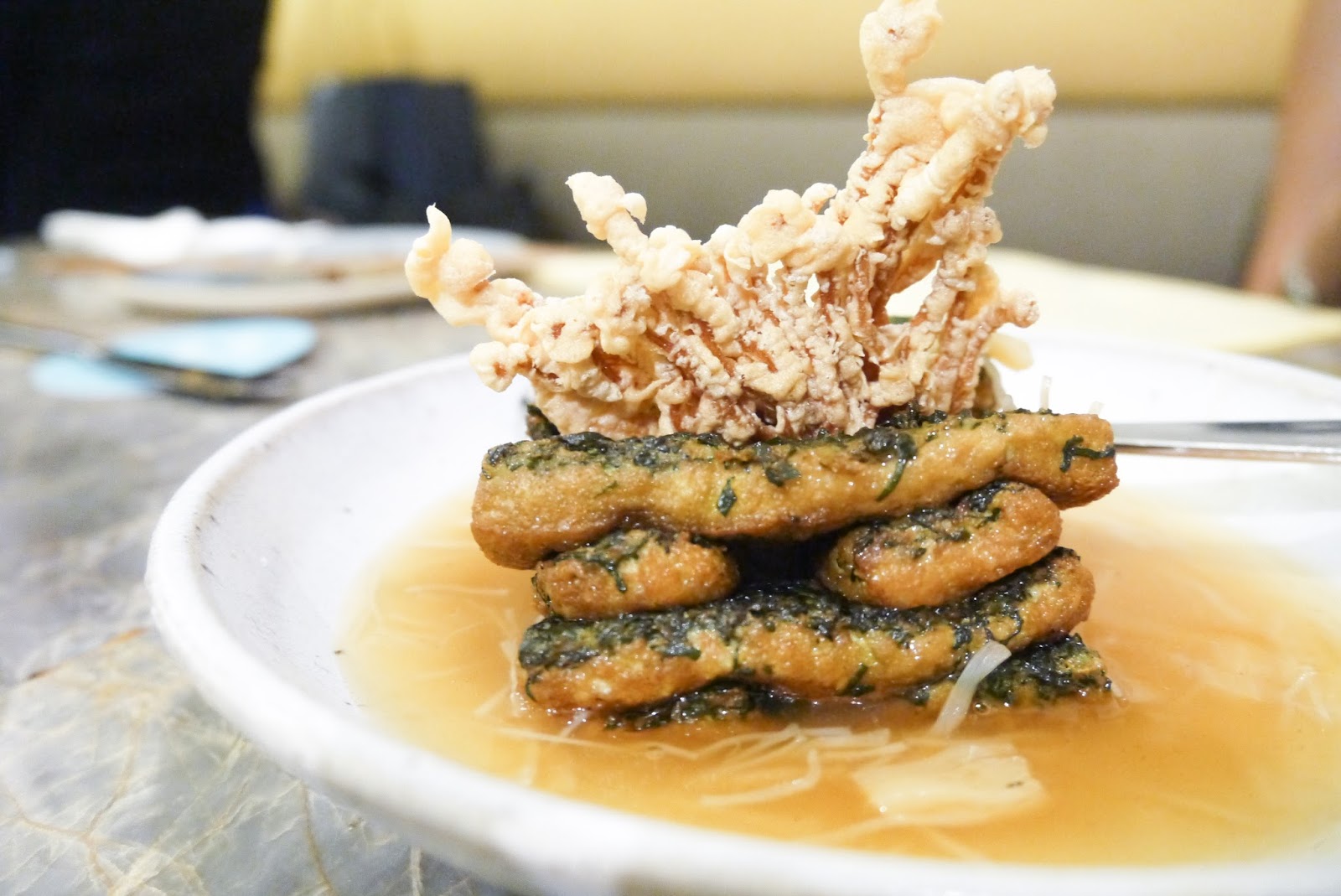 House made spinach egg tofu, finished with braised mushroom and dried scallops.