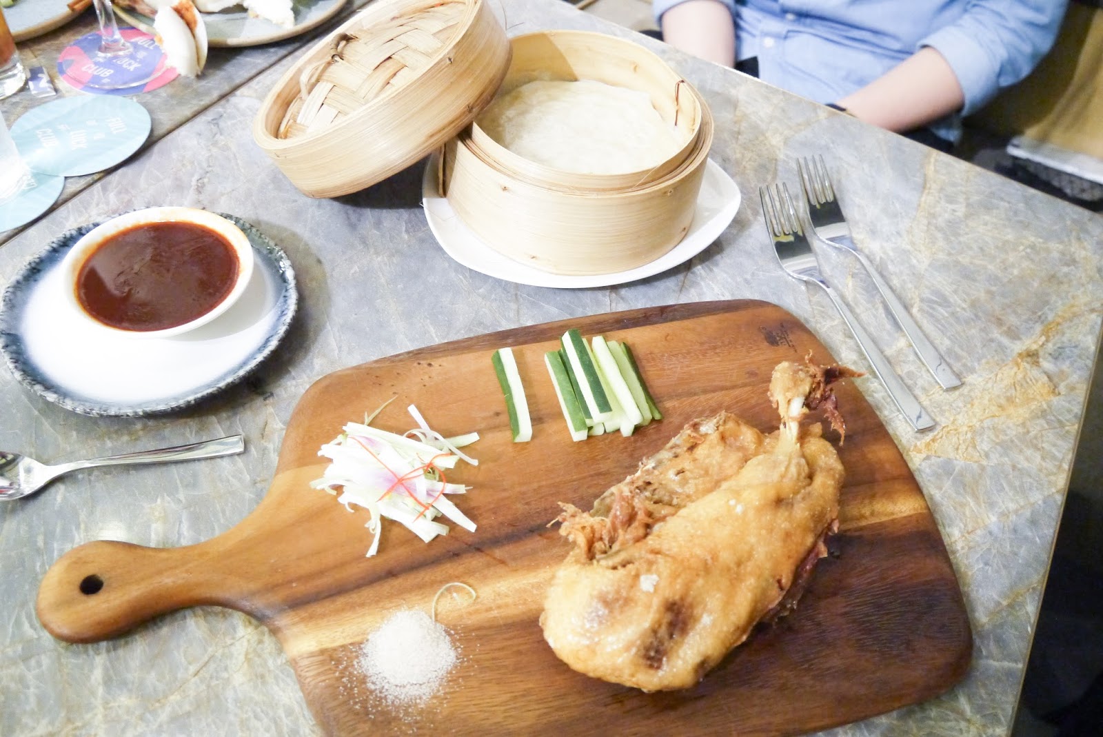 Crispy duck paired with hoisin sauce, cucumber, shredded spring onions and steamed Chinese pancakes.