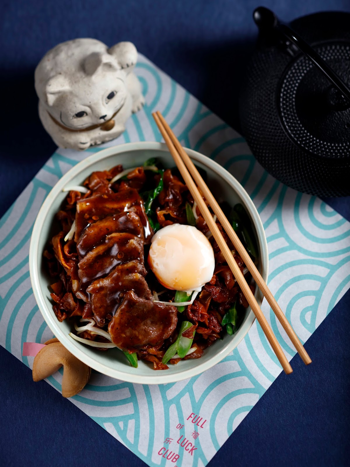 Sliced US prime boneless short over wok fried hor fun, black garlic truffle glaze and onsen egg.
