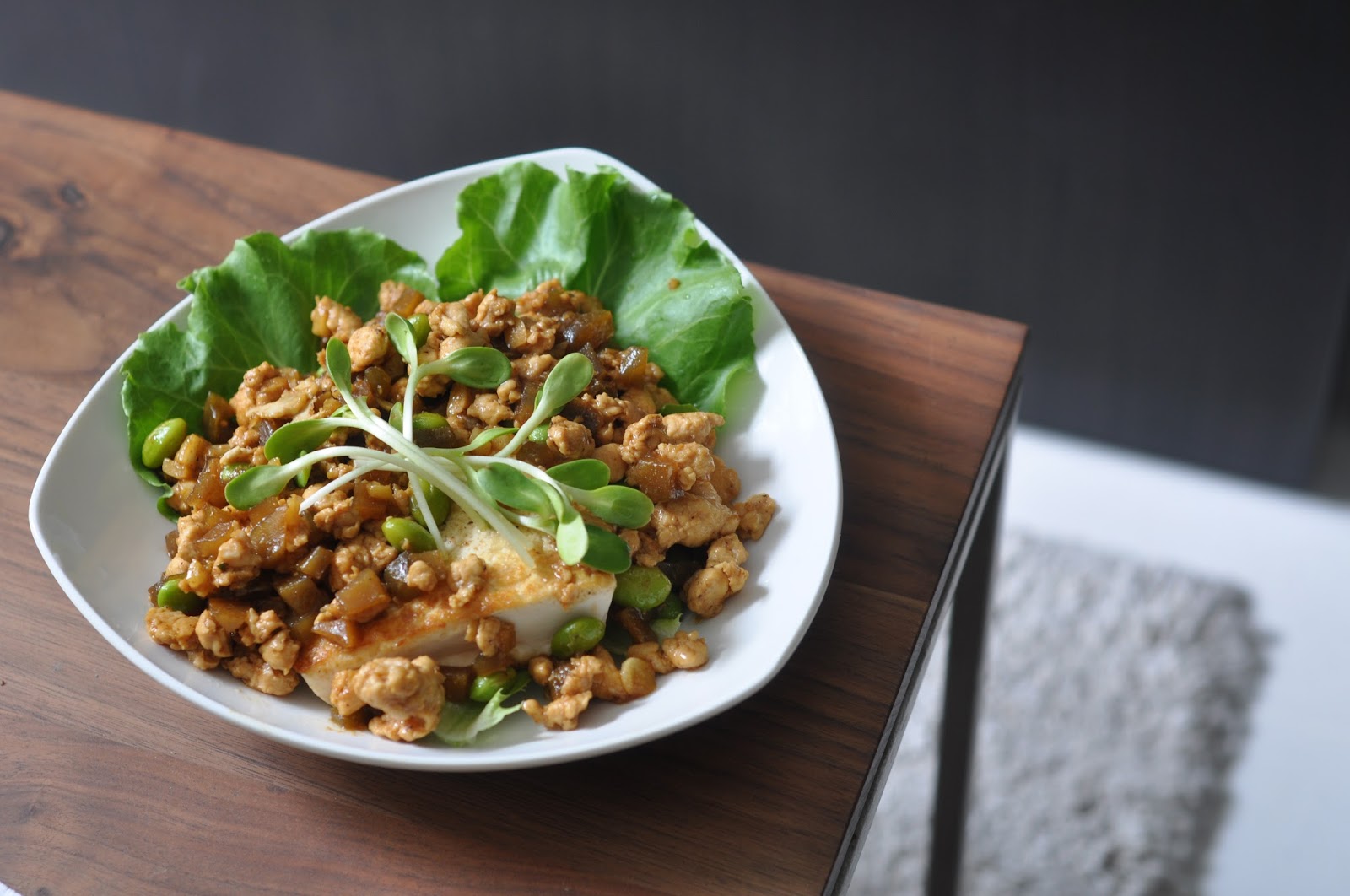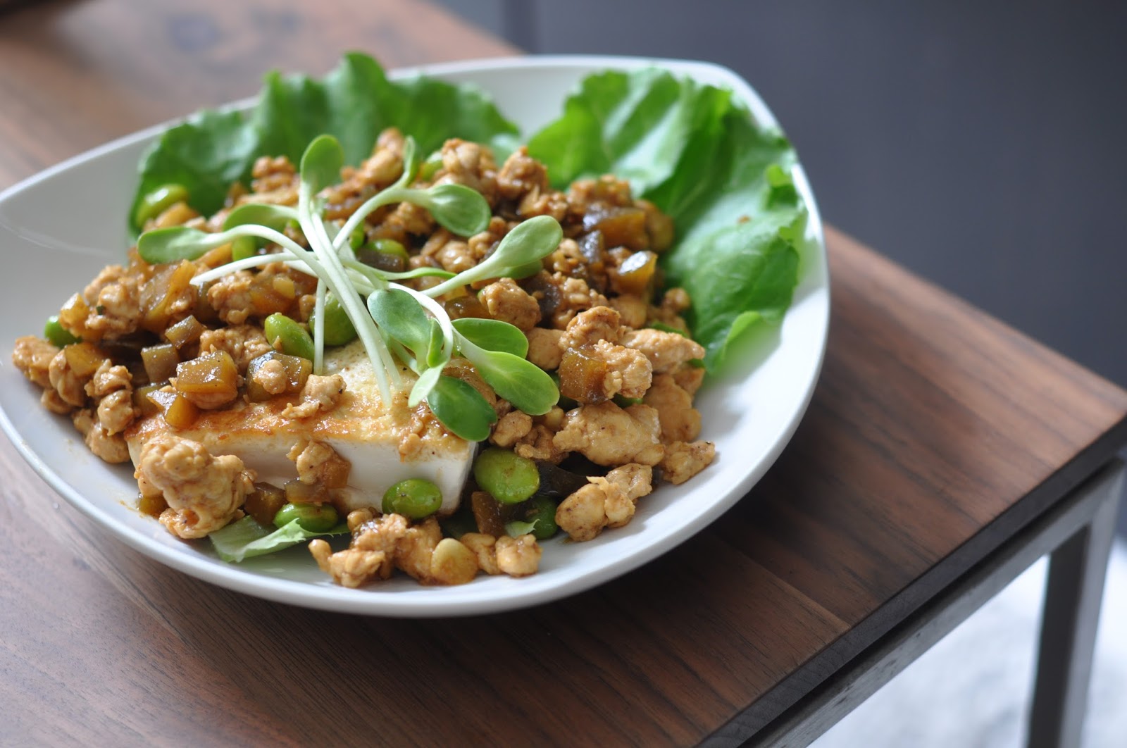 Ingredients: Fermented Radish (Chai Poh), Japanese Tofu, Minced Chicken Breast, Edamame, Lettuce and Pea Shoots, Olive oil, Oyster sauce, sweet soya sauce, garlic.