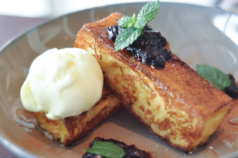 French Toast with blueberries and vanilla ice cream.