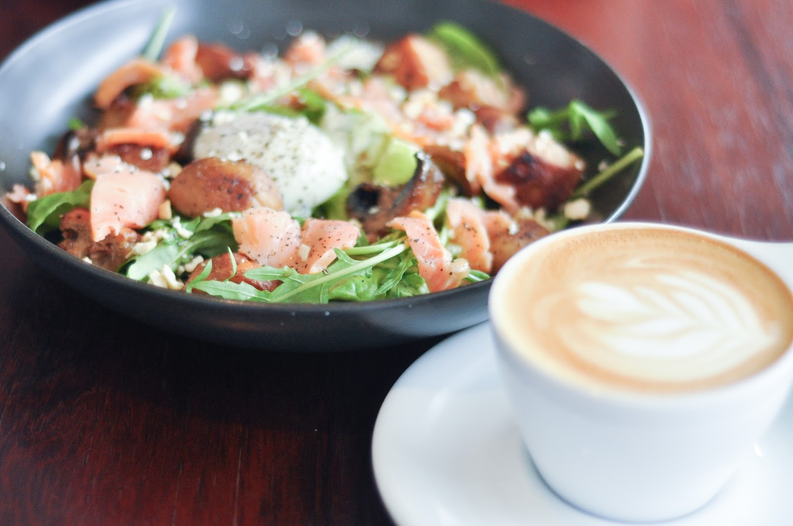 Salad with smoked salmon and bacon.