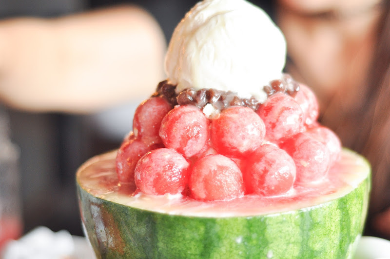 And watermelon bingsu, topped with fresh watermelon, red bean and vanilla ice cream, slurp!